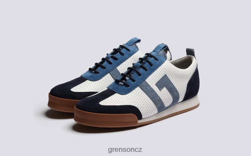 v bílé perforované telecí kůži a tónově modrých akcentech, sedí na malé bílé klínové mezipodešvi, texturovaná guma špička a gumová podrážka.
